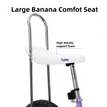 The classic banana seat adds a retro flair with modern comfort, and the low step-through steel frame ensures an easy and safe start for every ride. Vibrant purple paint, a charming front basket, and a fun ringing bell complete the look — your little rider will feel like the star of the street.