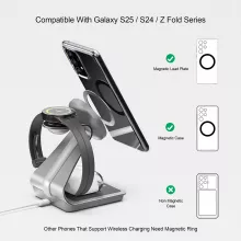 Equipped with a strong N52 double-layer magnet, your device snaps into place securely for stable charging every time. The aviation-grade aluminum alloy body ensures excellent heat dissipation, keeping your devices cool while charging efficiently. Built-in smart sensors monitor temperature, voltage, and current to protect your devices while delivering the fastest charge possible. This charging stand is compatible with Samsung Galaxy S25 Ultra, S24, S23, S22, S21 series, Note series, Fold series, Galaxy Watch series, and Galaxy Buds.