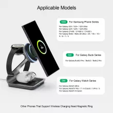 Say goodbye to messy cables and multiple chargers. This 3 in 1 magnetic wireless charging stand is designed to power up your Samsung phone, Galaxy Watch, and Galaxy Buds all at once. With just one sleek stand, you get a true wireless experience that keeps your desk or nightstand clean and organized. It delivers up to 15W fast charging for your phone, 3W for your watch, and 5W for your earbuds, making it the perfect charging hub for your daily essentials.