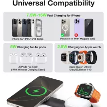 The foldable and lightweight design makes this charging station the ultimate travel companion. Slip it into your bag or suitcase, and enjoy a clutter-free charging experience wherever you are. Its stable magnetic connection ensures your devices stay in place while charging, making it ideal for busy lifestyles, business trips, or vacations.