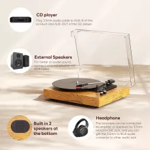 - Ready-to-Use Setup: With a built-in phono preamp, you can connect your speakers directly and start playing music right away without extra equipment.