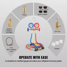 Designed for both DIY enthusiasts and HVAC professionals, this gauge set features shock-resistant, high-precision gauges with ±1.6% accuracy, reinforced 5-foot PVC hoses, and a full range of accessories for fast, secure connections. No assembly is needed—just unpack and get to work. Everything comes neatly packed in a blow-molded carrying case for easy portability.
