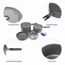 - Space-Saving Design: Each pot and pan has a folding locking handle for easy storage. The set fits neatly into a mesh bag with a drawstring closure, making it perfect for storage and transport in your camping bag.