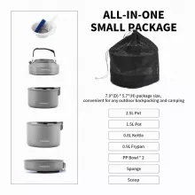 - Complete Cookware Set: Includes 2 saucepans with lids (2L and 1.5L), 1 kettle (0.8L), 1 frying pan (0.9L), 2 PP bowls, 1 kitchen scoop, and 1 sponge. Everything you need for cooking and serving meals on your outdoor adventures.