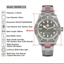 This timepiece is powered by a high-precision automatic mechanical movement, available in NH35, PT5000, or SW200 configurations. Its screw-down crown and case back enhance water resistance and durability, while the solid stainless steel bracelet with a secure folding clasp ensures a snug, comfortable fit throughout the day.