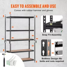 Setting up your shelving unit has never been easier. With a smart press-to-assemble design, you can put it together in minutes—no bolts or extra tools needed. The package includes a rubber hammer and protective gloves for a smooth, hassle-free setup.
