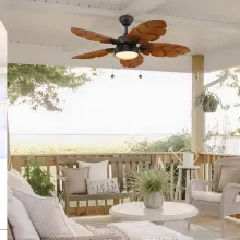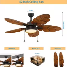 The eye-catching palm leaf design, paired with a durable alloy steel body and dark walnut ABS blades, ensures long-lasting performance even in humid environments. With integrated lighting and an easy pull chain mechanism, this fan offers the perfect balance of aesthetics, airflow, and illumination—all in one.