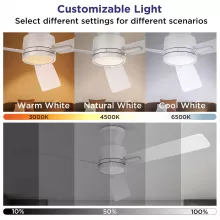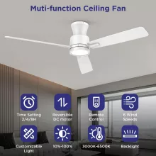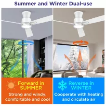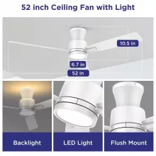 Transform your space with this stylish and functional 52-inch flush mount ceiling fan. Designed for rooms with low ceilings, this sleek, low-profile fan brings together quiet performance, customizable lighting, and year-round comfort. Its clean white finish, along with dual-sided blades in white and woodgrain, lets you match your décor effortlessly, while the compact form ensures maximum airflow without sacrificing headroom.