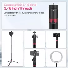 Whether you’re filming vlogs, taking travel shots, livestreaming, or lighting up a scene, this tripod provides a solid and adjustable base for smartphones, video lights, DSLRs, and mirrorless cameras. Crafted from durable aluminum alloy, it can hold up to 11 lbs of equipment, delivering reliable stability even in dynamic shooting environments. Its compact, foldable design makes it easy to pack, and the included carrying bag helps keep your gear organized on the move.