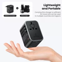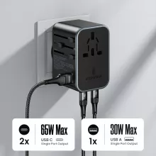 Travel smarter and lighter with this 65W GaN Universal Travel Adapter, your ultimate all-in-one solution for charging devices worldwide. Designed with cutting-edge GaN technology, it delivers powerful, efficient, and fast charging in a compact size. With support for USA, EU, UK, and AUS plug types, this travel adapter ensures you stay connected no matter where your adventures take you.