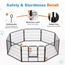 This 8-panel dog playpen is perfect for any pet owner looking to create a safe, enclosed space for their animals. Whether you are relaxing in the backyard, taking a camping trip, or need a safe play area indoors, this versatile pet pen meets your needs. It is ideal for keeping your pets safe while allowing them the freedom to play in a secure environment.