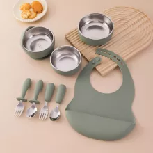 This feeding set combines sturdy stainless steel with gentle, BPA-free silicone, ensuring a durable yet baby-friendly experience. The detachable bowl and plate provide flexibility for easy cleaning and storage. The soft bib protects clothes from spills and can be removed effortlessly. Each piece is crafted to be free from harmful chemicals like latex, phthalates, and BPA, giving you peace of mind during every feeding session.