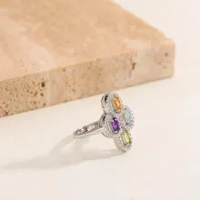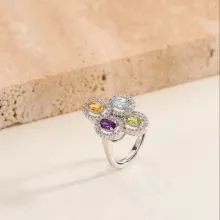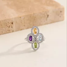 This stunning 925 sterling silver clover flower ring combines the beauty of nature with timeless elegance. Designed for the modern woman, it features vibrant natural gemstones—Amethyst, Peridot, Topaz, and Citrine—each symbolizing a different birthstone. The prong setting showcases these exquisite stones, making it a statement piece perfect for any special occasion, especially a glamorous party or celebration.