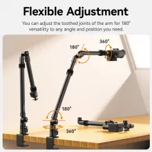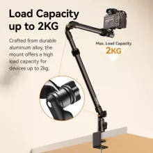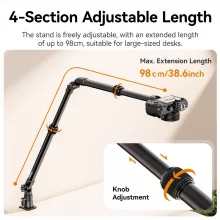 This mount is equipped with a strong C-clamp that securely attaches to desks up to 1.89 inches thick. The silicone pad ensures a firm, non-slip grip that won’t damage your furniture. Designed with a four-section adjustable arm, it extends up to 48.4 inches in length and reaches a shooting height of 25.6 inches—perfect for capturing detailed overhead views. The 360° ball head with a 1/4 inch screw allows you to adjust your camera or light to virtually any angle with ease.