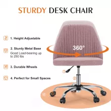 With its adjustable height, this chair can be tailored to fit your desk or vanity perfectly, ranging from 14.57 inches to 18.51 inches. The 360-degree swivel function ensures you can move freely and smoothly, and the sturdy base with PU casters lets you glide around effortlessly. Despite its compact size, it’s designed for maximum stability and durability, with a weight capacity of up to 250 lbs.