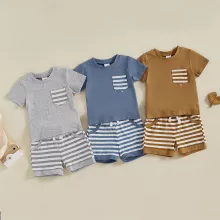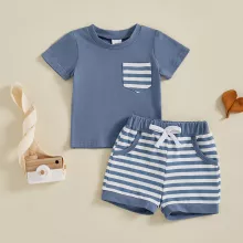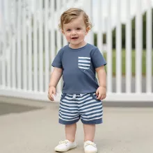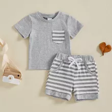Let your little one shine in this adorable 2-piece summer outfit set, designed for baby boys who love comfort and style. This charming set includes a soft, breathable short-sleeve t-shirt with a cute striped chest pocket and a pair of matching striped shorts with a stretchy waistband for an easy, snug fit. Whether he’s crawling, toddling, or taking those first steps, this outfit moves with him for all-day play.