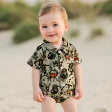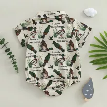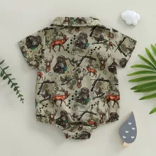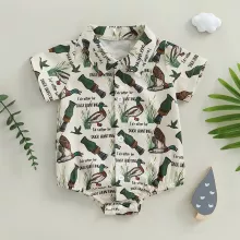 Get your baby boy ready for warm-weather fun with this charming short sleeve romper. Designed with a playful reindeer or duck all-over print, this one-piece outfit brings just the right mix of cute and casual. Featuring a smart lapel collar and easy button-up front, it’s perfect for everyday adventures, family outings, or capturing those picture-perfect moments. Whether you’re headed to the park, a summer BBQ, or simply enjoying some cozy playtime at home, this romper makes dressing your baby quick, stylish, and stress-free.