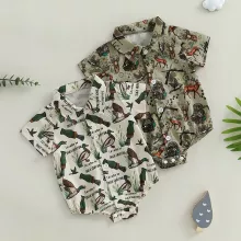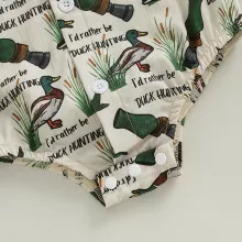 Crafted from lightweight, breathable polyester, this romper is made for summer comfort. The lapel neck and single-breasted design add a touch of grown-up charm while keeping your little guy cool and relaxed. With a soft, gentle fabric and roomy fit, your baby can move freely and comfortably all day long. Choose between two adorable prints — a playful duck or festive reindeer — and two versatile colors: khaki or army green.