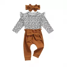 Dress your baby girl in irresistible charm with this 3-piece leopard print outfit set. Designed with a perfect balance of cuteness and comfort, this stylish set includes a long sleeve ruffle romper, matching bow tie pants, and a coordinating headband — everything you need for an effortlessly adorable look. Whether it’s for a cozy day in, a family gathering, or a fun photo session, this outfit is sure to steal hearts.