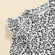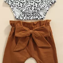 Made from a soft cotton blend, the fabric feels gentle against your baby’s skin while still being durable enough for active little movers. The pullover romper features ruffled shoulders and an eye-catching leopard print, adding a playful yet trendy touch. Paired with high-waisted bow tie pants and an easy-to-wear headband, your baby will be stylish from head to toe.