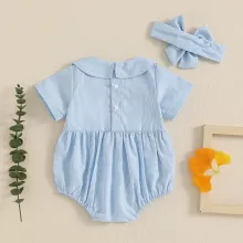 This romper is not just cute but also functional, making it a must-have in your baby’s wardrobe. The sweet duck embroidery and the classic doll collar elevate the look, while the soft polyester material ensures comfort throughout the day. The romper is designed with crotch buttons, making diaper changes quick and easy, which is a huge plus for busy parents. Plus, the included headband completes the outfit for that extra touch of cuteness. Whether it’s a casual day at home or a special occasion, this romper will keep your baby girl stylish, comfortable, and ready for any adventure.