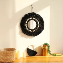 Add a warm, stylish touch to your space with this Black Macrame Round Wall Mirror featuring wooden bead accents. The perfect blend of natural texture and modern charm, this mirror brings an effortlessly cool boho vibe into any room. Whether you’re designing a calming bedroom retreat, enhancing a minimalist hallway, or adding flair to a cozy living room corner, this piece makes a stunning focal point on any wall.