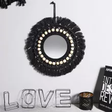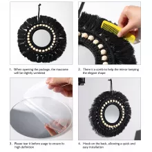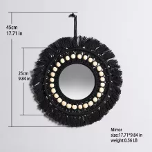 This decorative mirror is handcrafted with intricate black macrame framing a round glass mirror, finished with smooth wooden beads that add a subtle rustic edge. The neutral color palette makes it easy to pair with a variety of styles—from Scandinavian simplicity to farmhouse warmth to eclectic bohemian décor. Measuring approximately 12 inches in diameter, it fits perfectly above dressers, vanities, entryway tables, or gallery walls.
