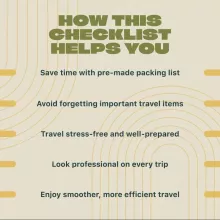 Business travelers, entrepreneurs, corporate professionals, remote workers, and anyone who frequently attends conferences, meetings, or training sessions. This checklist stands out because it’s specifically designed for the unique demands of business travel—not just leisure trips.