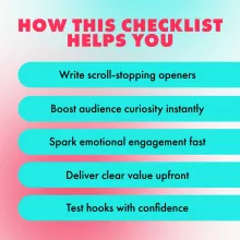 This checklist is perfect for small business owners, digital creators, coaches, social media managers, freelancers, and anyone who wants to write stronger hooks that capture and keep attention. If you want to connect with your audience, boost engagement, and make your message impossible to ignore, this is for you.