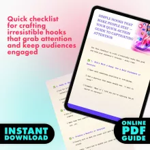 Want to grab your audience’s attention and make them stick around? The Checklist: Simple Hooks That Make People Stay — Your Quick-Action Guide to Captivating Attention is your shortcut to writing hooks that stop the scroll, spark curiosity, and hold interest from the very first second. This powerful digital download is designed for creators, entrepreneurs, coaches, and marketers who want clear, actionable strategies without the fluff. Whether you’re writing social posts, sales pages, video intros, or emails, this checklist gives you the exact formulas to craft hooks that instantly resonate and keep people engaged. No more guessing, no more bland openers—just proven techniques that work every time.