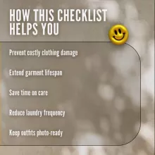 Your clothes work hard for you — it’s time to return the favor. Download the Checklist: Wardrobe Wizardry: Your Ultimate Fashion Care Spellbook now and start practicing Fashion Care 101: Make Your Clothes Last like a true style sorcerer. Click “Add to Cart” and give your wardrobe the magic it deserves!