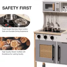 The Classic Gray Wooden Play Kitchen Set is built to withstand years of active play. Made from durable MDF and premium wood, it’s a sturdy, safe, and secure option for your child’s playtime. The ample storage space, including a top microwave and large cabinet, allows children to organize their kitchen accessories and keep their play area tidy.