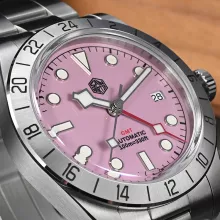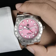 Elevate your style with this stunning 39mm automatic GMT men’s watch, designed for those who appreciate both luxury and practicality. Featuring a beautiful enamel pink dial, this watch is a statement piece that blends modern aesthetics with sophisticated functionality. Whether you’re in the boardroom or enjoying a casual day out, this timepiece complements any occasion with its elegant and sleek design. Crafted with precision, this watch not only offers exceptional durability but also ensures that you are on time wherever you go.