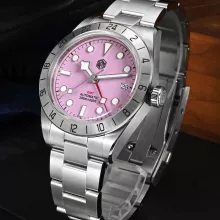 This automatic GMT men’s watch stands out for its exquisite craftsmanship, bold design, and impressive functionality. The enamel pink dial catches the eye with its vibrant hue, making it the perfect accessory for any gentleman who desires a watch that makes a statement. The watch features a screw-down crown and a screw-down case back, offering extra protection from water and dust. Ideal for business professionals, travelers, or those who enjoy precision timekeeping, this watch can be worn confidently in a variety of settings.