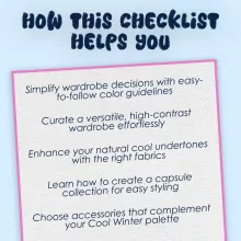 Ready to transform your wardrobe into a collection of perfectly tailored outfits that highlight your natural cool brilliance? The Cool Winter Closet Cheat Sheet is the ultimate digital guide to help you create a high-contrast, sharp, and stylish wardrobe that complements your Cool Winter coloring. This easy-to-follow checklist will simplify your closet makeover with clear instructions and expert tips on choosing the right colors, styles, and pieces. Say goodbye to wardrobe confusion and hello to a closet that feels like you!