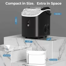 Whether you’re preparing iced coffee in the morning, sipping cocktails at night, or need chilled water all day long, this machine is your perfect companion. Compact and portable, it’s ideal for kitchens, living rooms, home offices, RVs, or dorm rooms. Unlike traditional hard cubes, the pebble-style ice is easier to chew, melts evenly, and makes drinks feel more refreshing.