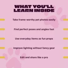 This downloadable guide is packed with expert tips and real-life tricks to help you plan, shoot, and edit photos that you’ll be proud to share (and maybe even frame). Perfect for pet parents, social media creators, or small pet-based businesses!