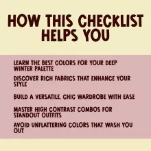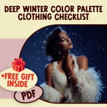 This downloadable checklist is not just a simple guide—it’s your roadmap to mastering the Deep Winter color palette. With precise instructions on which colors to embrace, the best fabrics to choose, and key clothing pieces to incorporate, you’ll be effortlessly stylish all season long.