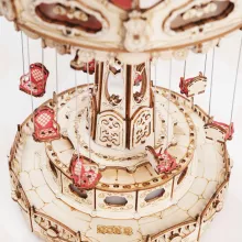 Featuring 289 precisely cut wooden pieces, this project offers hours of hands-on fun. The design is inspired by traditional amusement park rides, featuring a retro-style canopy, ornate detailing, and warm lighting that brings the entire model to life. A built-in music box adds an extra layer of magic as the carousel gently rotates. The central mirrored pillar reflects the movement and light, creating a mesmerizing display that feels like stepping into a fairytale.
