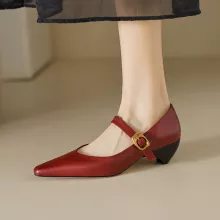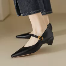 These Mary Jane pumps are a fashionable take on a classic favorite. With a sleek pointed toe and a unique “strange style” high heel measuring approximately 2 inches (5 cm), they offer a sophisticated silhouette that flatters your legs. The secure buckle strap adds a charming accent while ensuring a snug fit. Built with a durable rubber outsole, these heels provide stability and traction without compromising style. Their genuine sheepskin upper and lining ensure breathability and lasting comfort, even on warmer days.