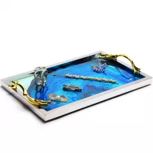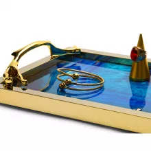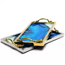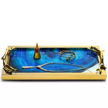 What sets this tray apart is its striking visual design—a swirling agate-style pattern in vivid blues, contrasted with shimmering gold plating. This mix of natural inspiration and modern glam adds a distinctive flair to your decor. It blends seamlessly into any interior style while standing out just enough to make a luxurious impression.