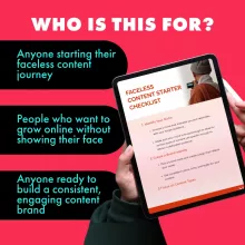 Don’t let fear of being on camera hold you back. Download the Faceless Content Starter Checklist today and start creating content that grows your audience, builds your brand, and makes an impact—all without showing your face. Your faceless content journey starts now!