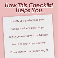 Stop second-guessing your choice. With this downloadable checklist, you’ll have a clear, organized plan for selecting a ring that feels just right. No more endless scrolling or uncertainty—just a confident, informed decision every time. Download the Find Your Perfect Ring Style Checklist today and start your journey to finding the ring you’ll treasure forever.
