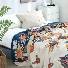 Experience the delicate charm and unmatched comfort of our Floral Cotton Gauze Throw Blanket – the perfect blend of elegance and function for your bedroom or lounge space. Designed to bring a refreshing, airy feel during the warmer months, this soft and breathable throw adds a touch of nature-inspired beauty to your everyday living. The jacquard floral pattern, woven with care, gives a subtle texture that feels as inviting as it looks.