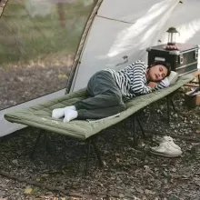 Upgrade your outdoor sleep setup with this foldable camping mattress pad—a lightweight and cozy solution designed to make every night under the stars feel like home. Measuring 75 x 26 inches, this mattress fits most camp cots and outdoor beds while also doubling as a cushioned floor mat. With a soft peach velvet surface and breathable down-like cotton filling, it offers a plush and supportive sleep no matter where you are.