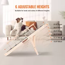 Help your furry friends jump higher, run faster, and live more comfortably with this 47.2-inch adjustable pet ramp. Whether you have a small puppy, an older dog, or a pet recovering from an injury, this sturdy folding ramp is the ideal solution for providing your pet with easy access to sofas, beds, cars, and more. Made from durable pine wood, it offers both stability and style, ensuring your pet can climb safely and confidently every time.