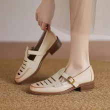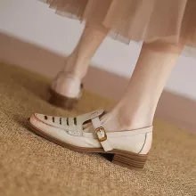 The delicately hollowed-out upper offers a breezy, airy feel ideal for warmer weather. The buckle strap closure provides a secure and adjustable fit, while the 3.5 cm square heel gives you a subtle lift with stability and ease. With a minimalist silhouette and soft neutral tones, these Mary Janes are versatile enough to complement everything from flowy skirts to tailored pants.