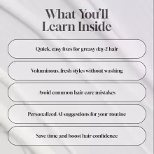 This guide is perfect for anyone tired of battling greasy hair and looking for a quick and effective solution. Whether you’re in a rush or just want to extend the life of your hairstyle, this guide provides actionable advice that works for every hair type. With its clear instructions, expert tips, and modern approach to hair care, it’s different from other resources that offer generic advice. Plus, it includes cutting-edge AI prompts that make it the first of its kind in helping you personalize your routine.