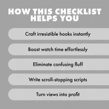 Don’t let your videos fall flat. Download “Hooked Till the End!” — The Ultimate Script Checklist to Keep Viewers Watching today and start creating scripts that captivate, convert, and grow your audience. Your next viral video starts here—get it now!