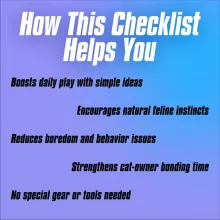 Unlike generic cat playbooks, this cat enrichment eBook combines playful variety, practical setups, and professional tips—all designed with your cat’s instincts in mind. With activities suitable for cats of all ages, you’ll always have a new way to keep your feline engaged and enriched. Whether it’s a rainy day or just part of your daily routine, this indoor cat checklist will help you build a life full of joy and adventure for your furry friend.